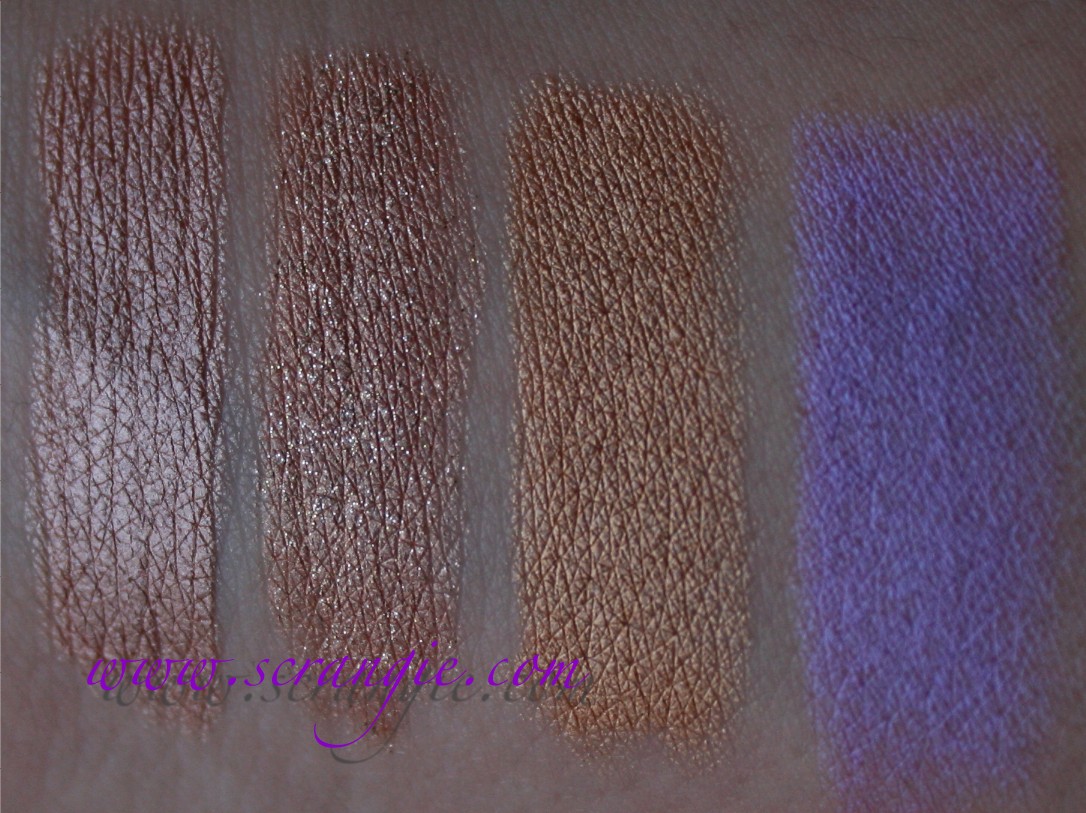 Mercury, Barracuda, Wasteland, Rehab. Barracuda really stands out here, doesn't it? I love that glitter. And I'm not sure if you can see it very well, but Rehab has a really pretty reddish-gold duochrome sheen to it. It's subtle, but when you catch it just right, it's so pretty.The texture of these pencils is really similar to the 24/7 eyeliner. They're soft, silky and extremely smooth. They really do glide on, no tugging or skipping. They're very opaque and pigmented and you really don't need more than one or two swipes of color.