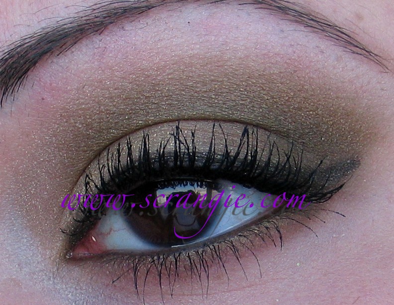 Gold half of shadow duo, green half of shadow duo, Khaki liner, Coral Beach blush and Serengeti gloss. If you enlarge the picture, you can see the pretty sparkly microglitter in the gloss and the liner.The eyeshadow duo has a very silky, velvety texture. The pigmentation is very good, but it's also buildable. You can do a more sheer wash if you apply lightly, but you can also build up both colors to make them sparkle more. I find that the gold half is easiest to apply with the fingers; it has a light, flaky texture that looks more glittery when applied with a brush, but more of a smooth metallic when applied with the fingers. It can look slightly flaky when applied with a brush, but that is easily remedied (if you don't want the sparkly look) by quickly smoothing your finger over it after applying.